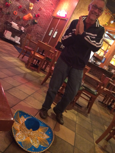But then, the musical marauders didn’t turn toward tamale’s table. They stopped at mine! Total confusion. But then it happened. The big sombrero …