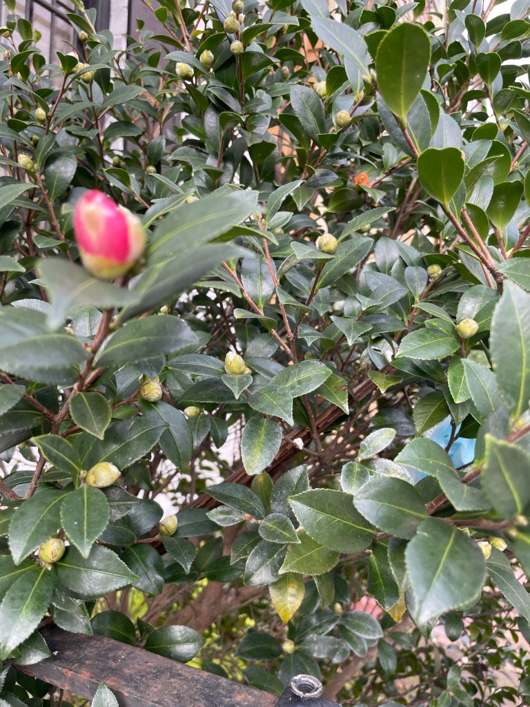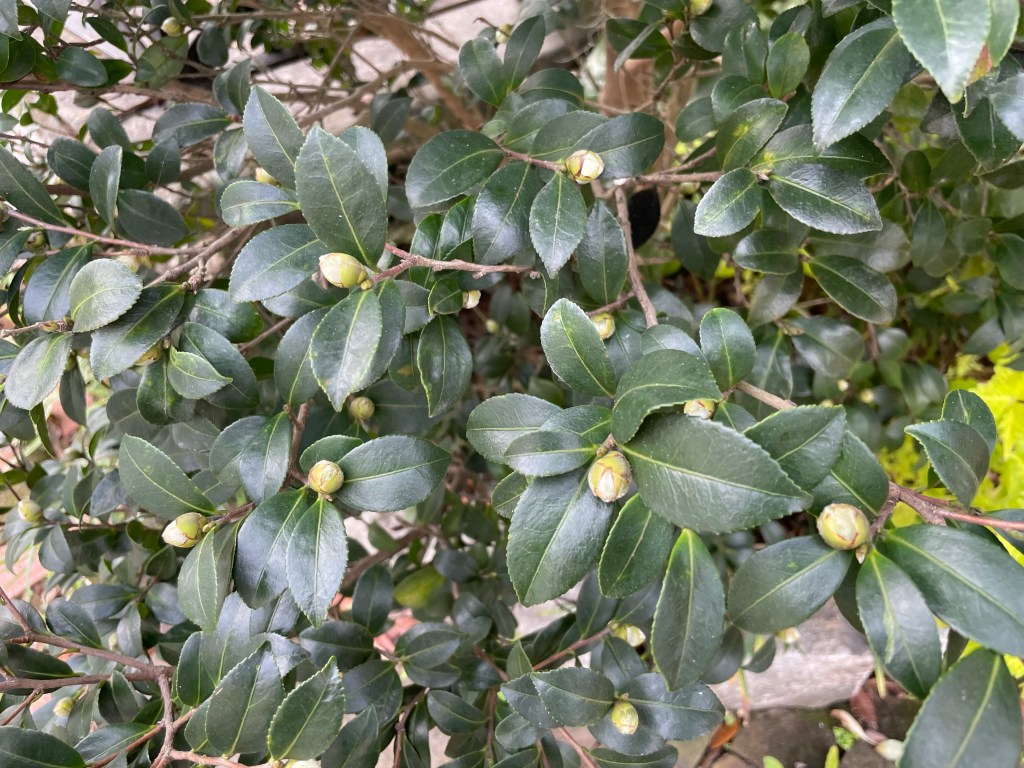 Camellias (Savannah’s “cold weather azaleas”) ready to burst into bloom—and a few getting a head start: