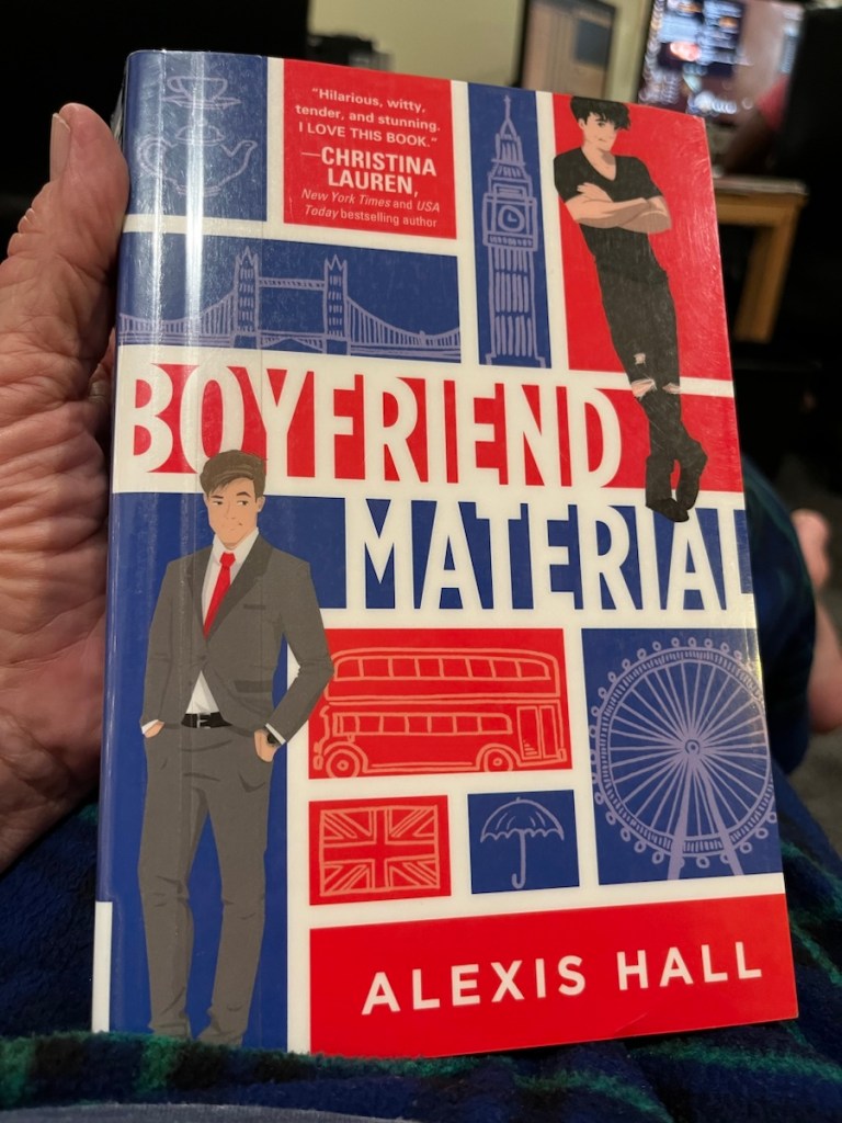 The book we just finished, Boyfriend Material, is pure escape fiction, a hilarious and heartwarming novel about two opposites: Luc, the messy and often-scandal-ridden son of two aging rock stars and Oliver, a perfectionist English barrister. The story follows the trajectory of their unlikely romance.