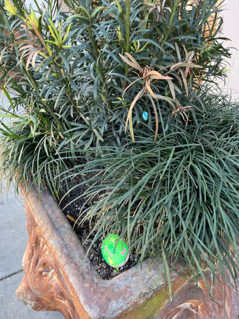 Walking along Bay Street near our place here in downtown Savannah, HR and I caught sight of a little green oval tucked into a planter