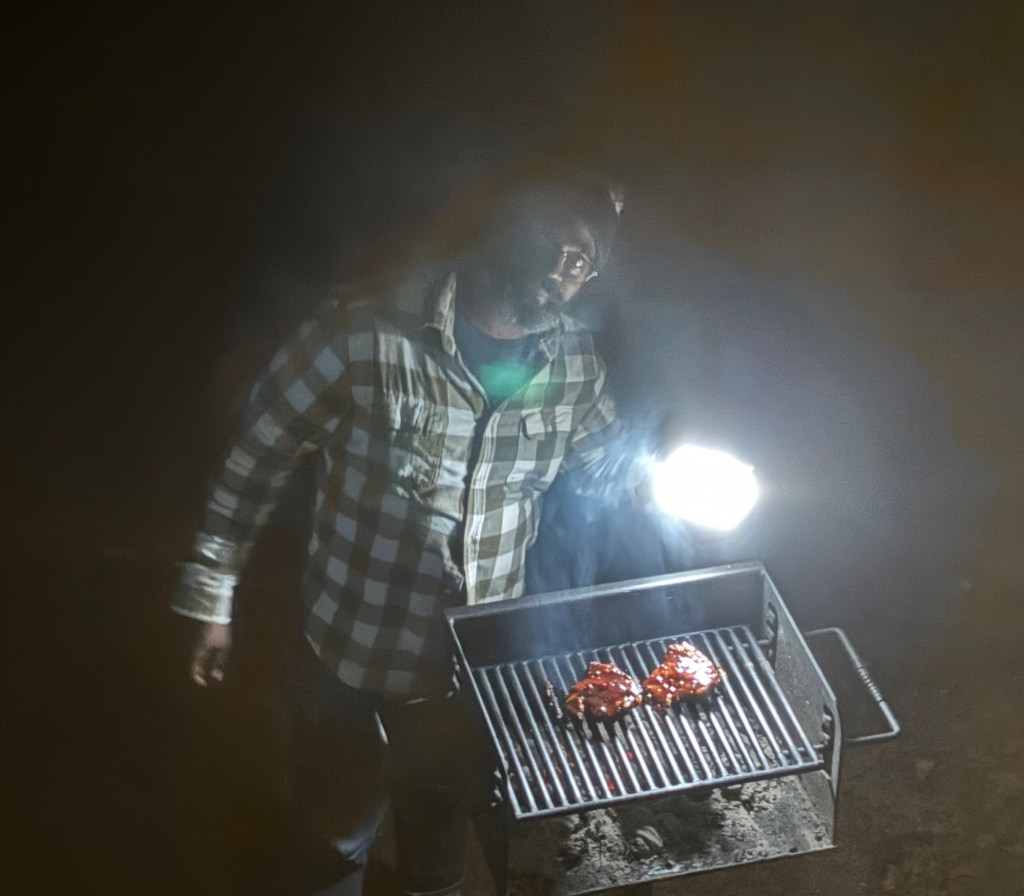 2. HR grilling bbq chicken thighs while I watch comfortably from the cabin porch.