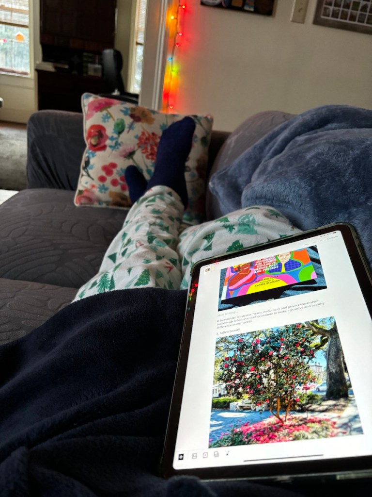 4. Friday morning at 7:36, in my pj’s and robe, lazily blogging on the couch. (Hey, I’m retired.)