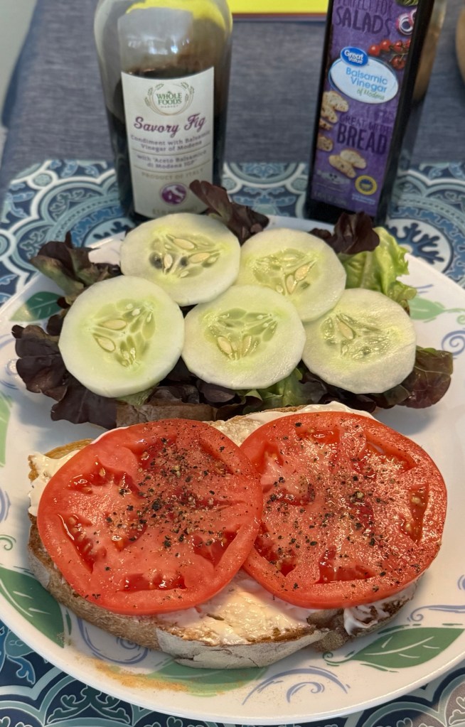 Robert got fancy, and in my opinion, “purist tomato sandwich blasphemous,” with flavored vinegars and gobs of cucumbers, instead of simple salt, pepper and Duke’s mayonnaise.