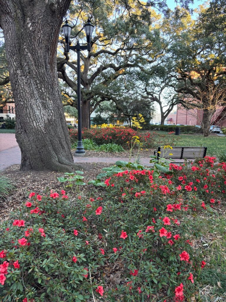 Winter’s Chill here in Savannah (28 the other night — COLD FOR US!) can’t hold back downtown’s blooming colors.