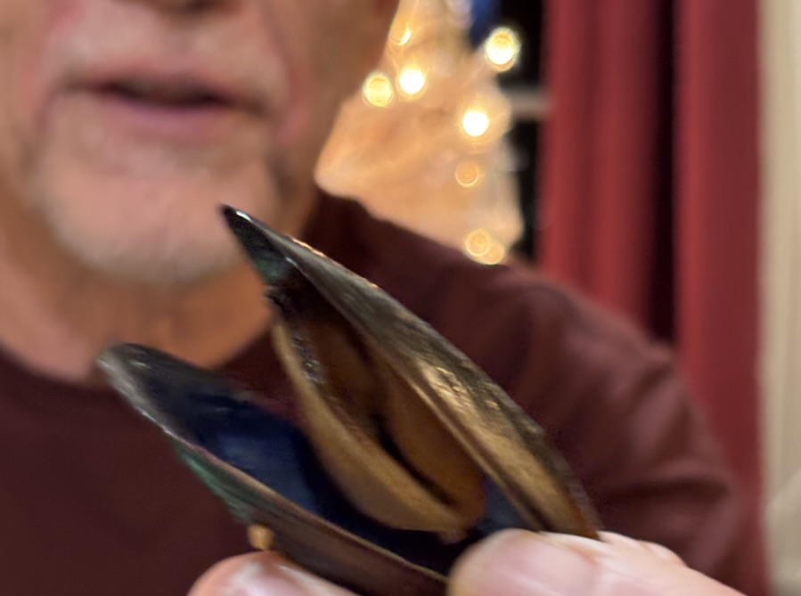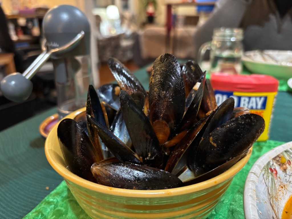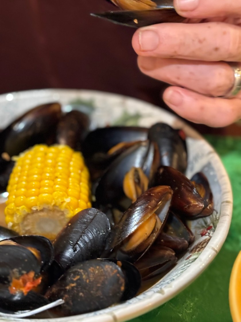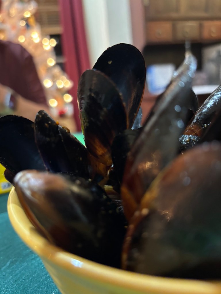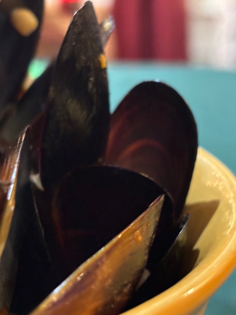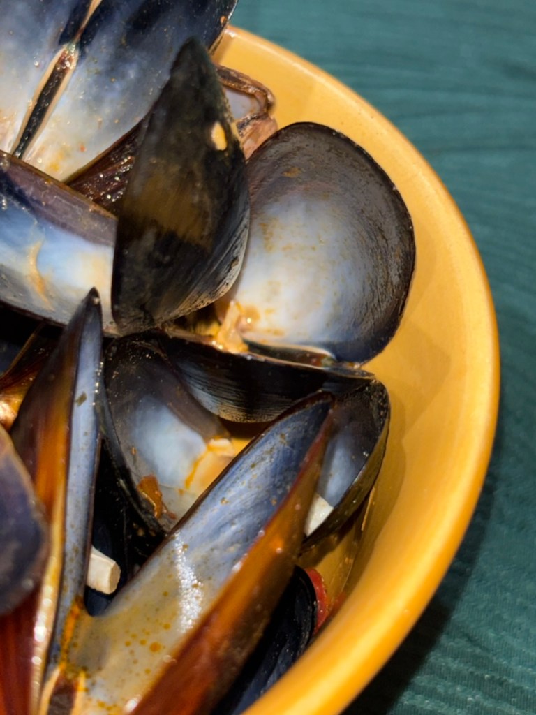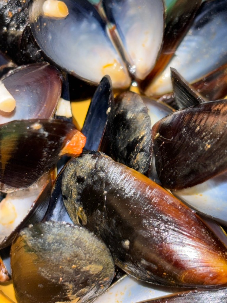 While I was a bit more classy — Mussels with tomato, garlic and white wine sauce (ridiculously easy and quick to prepare) …