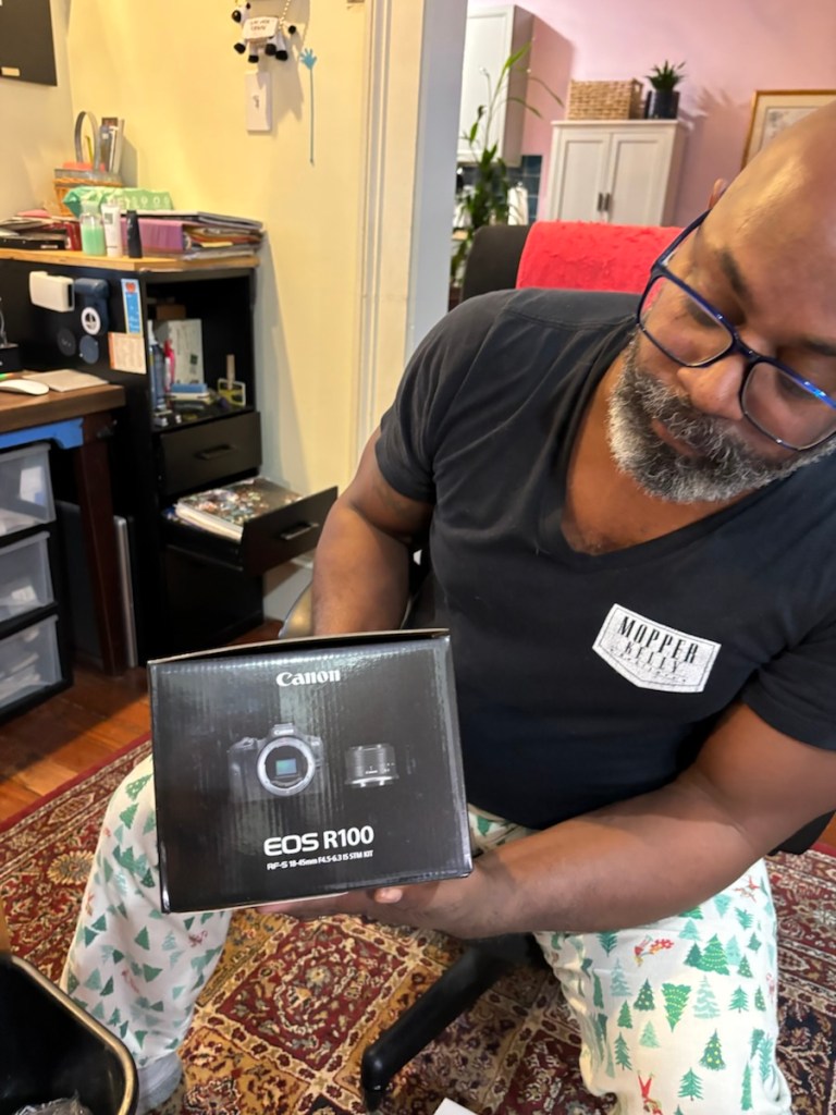 1. HR all excited about his new Canon EOS R100 camera.