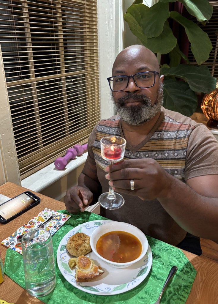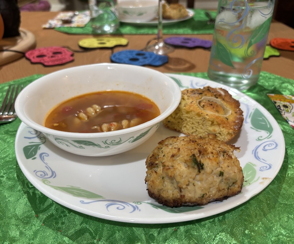 Then tonight HR and I had our Dia de los Muertos supper, consisting of several of our deceased parents’ favorite foods: Maryland crab cakes, homemade vegetable soup and cornbread.