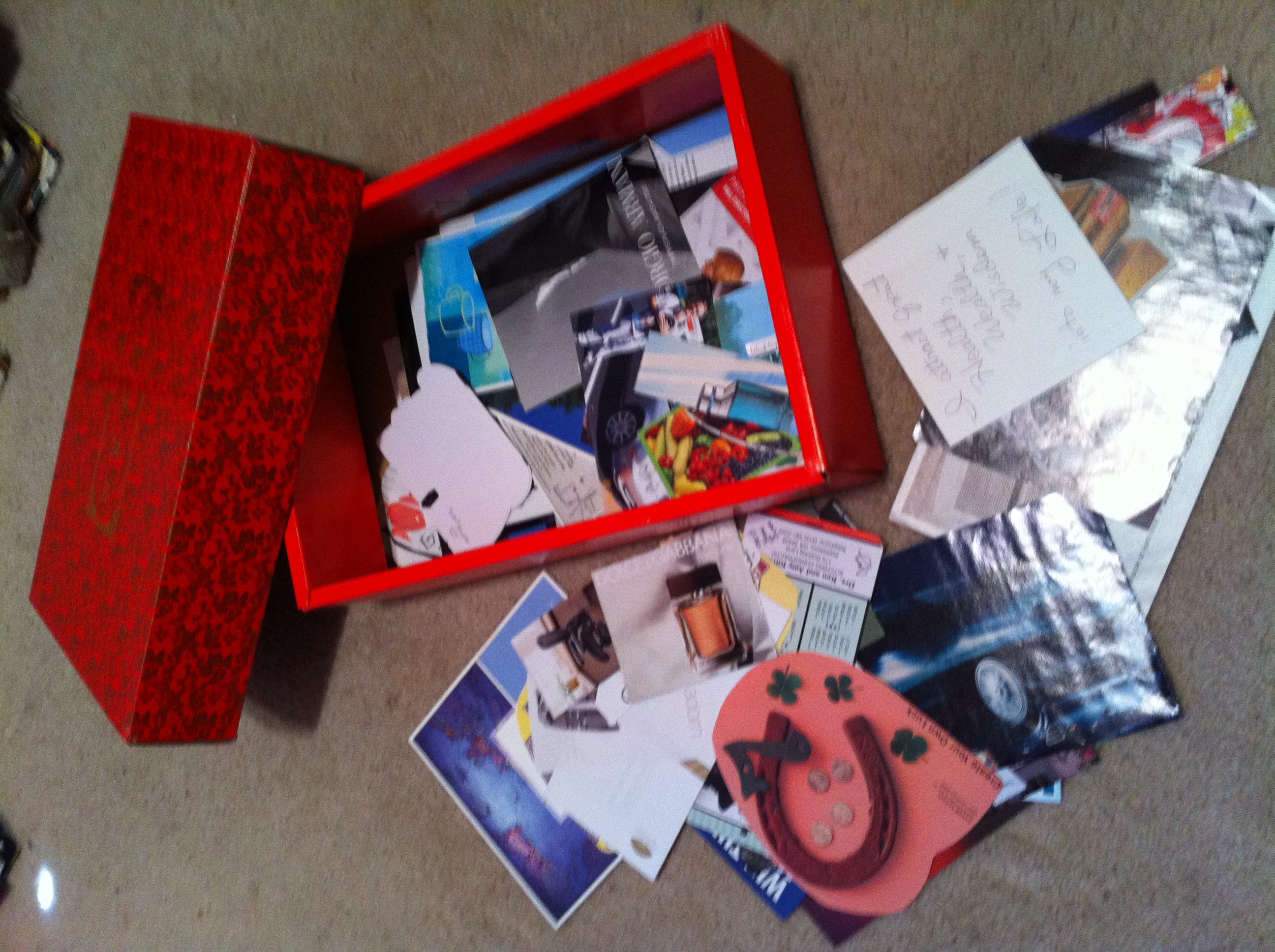 Next, go through magazines, brochures, newspapers, etc. and find pictures of that which gives you joy. Anything. I suggest that you DO NOT worry about trying to organize or structure this process–have fun with it. Look for pictures, colors, words, abstractions that “light you up” in some way. Cut them out and put them in your box. Also look for photos, little items, paint samples, memorabilia which cause your heart to sing. You have thus started the Happiness Box strategy.