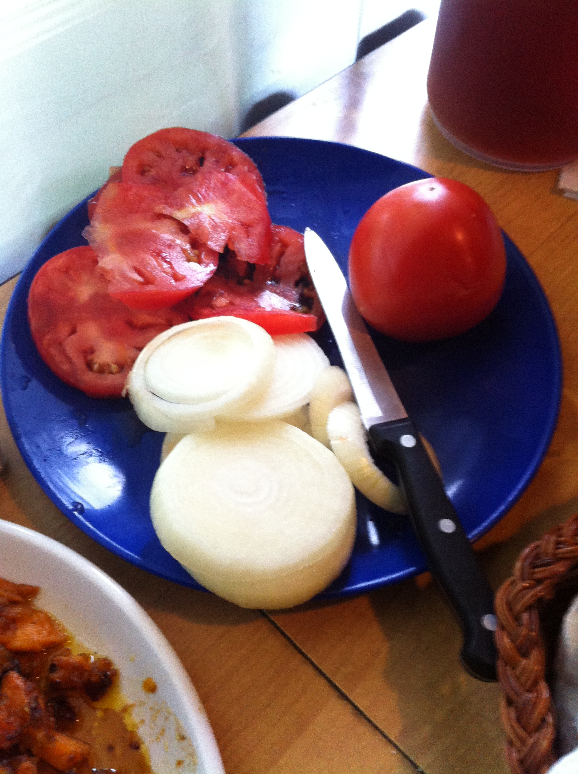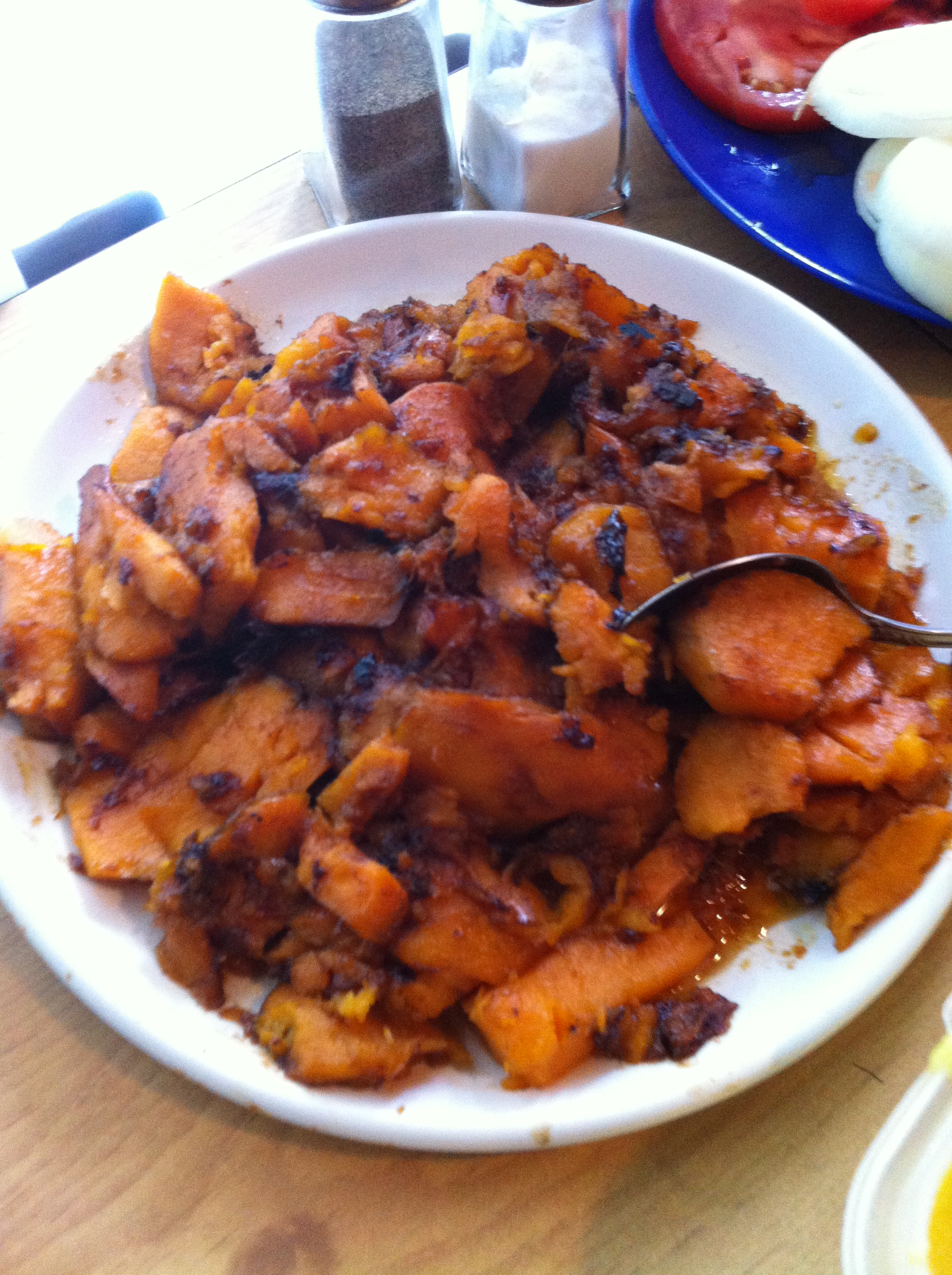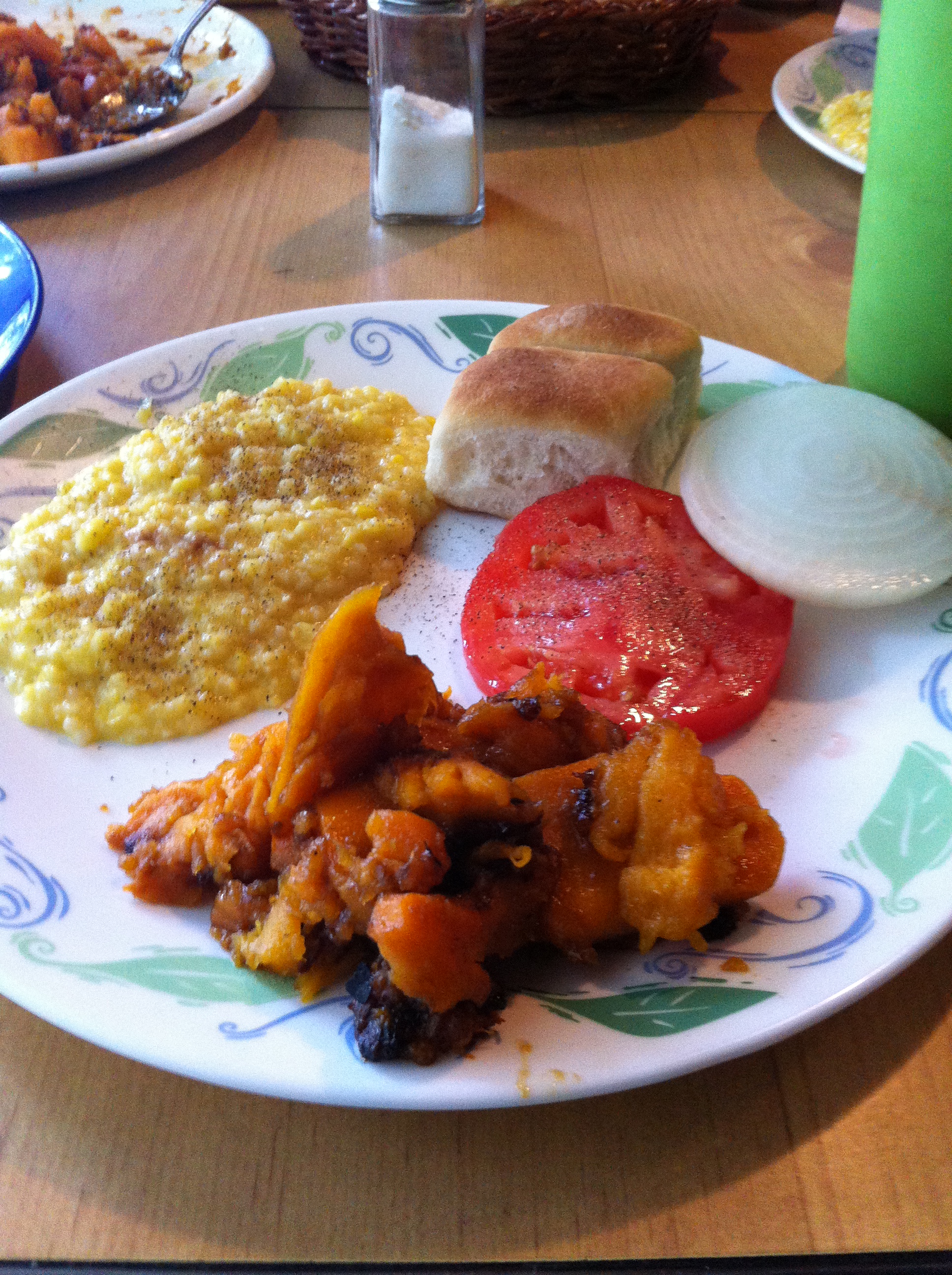 My favorite meal in the whole wide world consists of 1.) my dad’s creamed yellow corn. 2.) My mom’s fried sweet potatoes. 3.) A tomato and an onion.