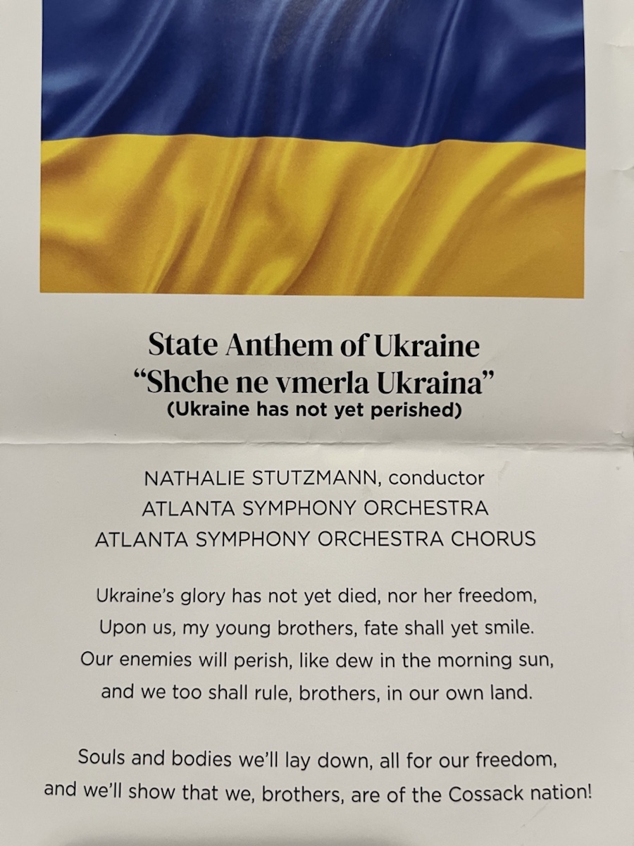 As I mentioned In Friday ‘s post, the Atlanta Symphony Orchestra and Chorus sang the very moving national anthem of Ukraine. And dedicated the evening to the war torn nation. Several members of the orchestra were Ukrainian.
