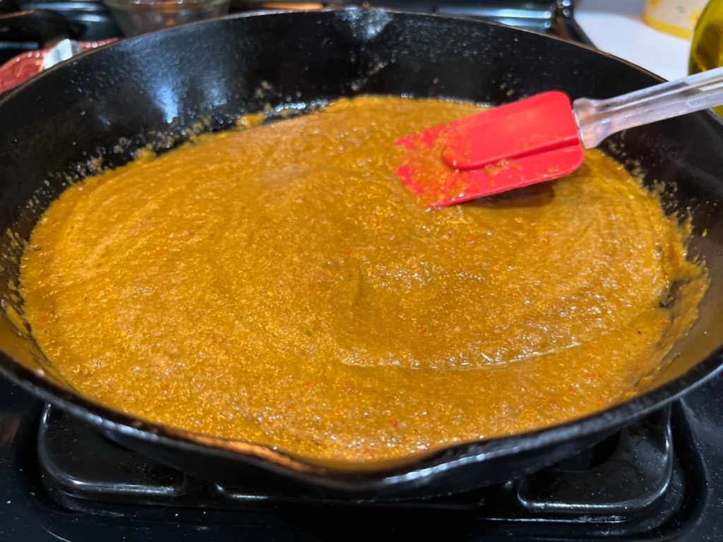 Then I made a purée of onions, garlic, shallots, red bell pepper, fresh ginger, fresh turmeric and homemade vegetable broth.