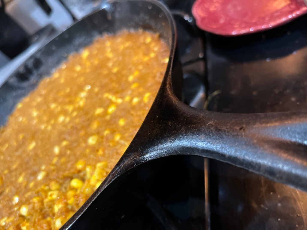 I found a recipe for Sweet Corn, Shrimp and Rice Skillet. Initially, I thought it was too fancy for me to try. HR’s the gourmet chef. But then I decided to attempt it anyway. In my grandmother’s 10-inch cast-iron skillet.