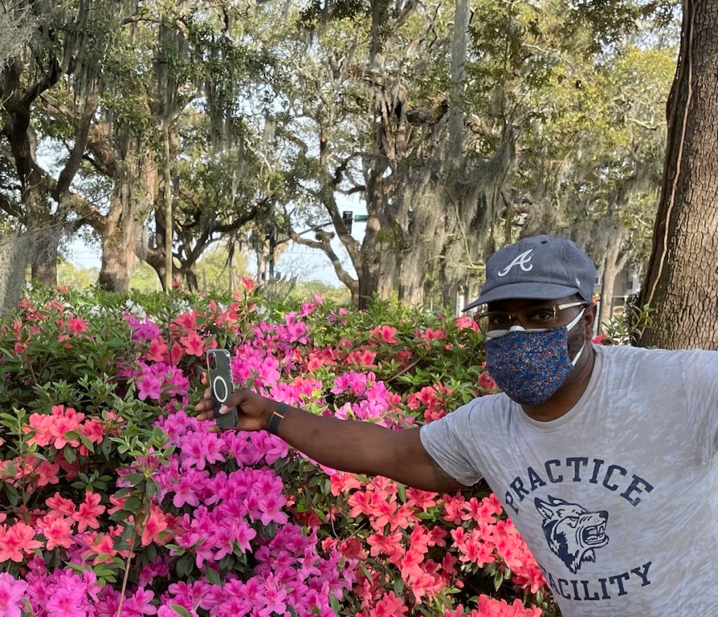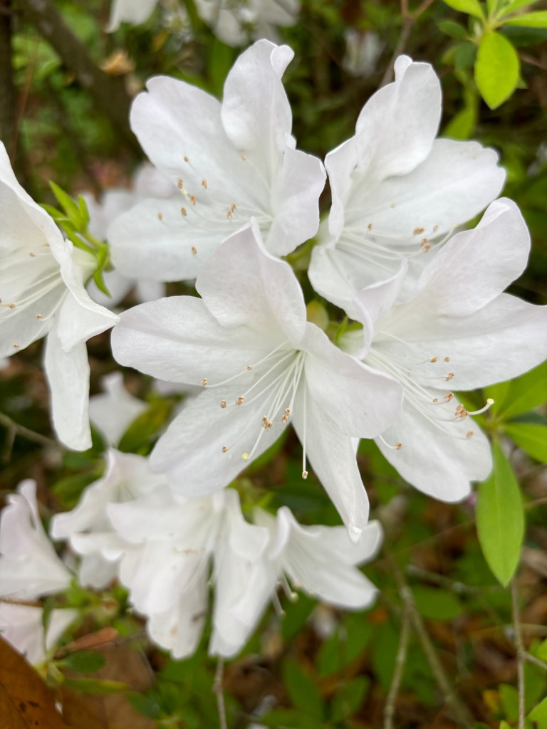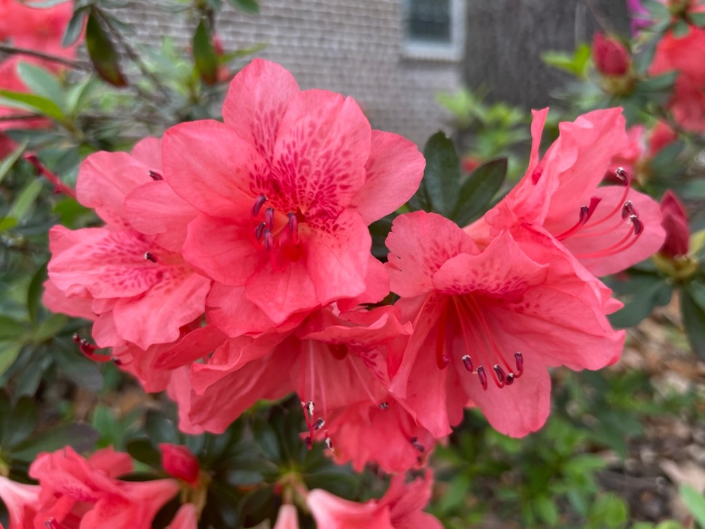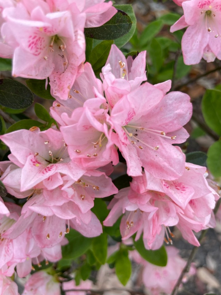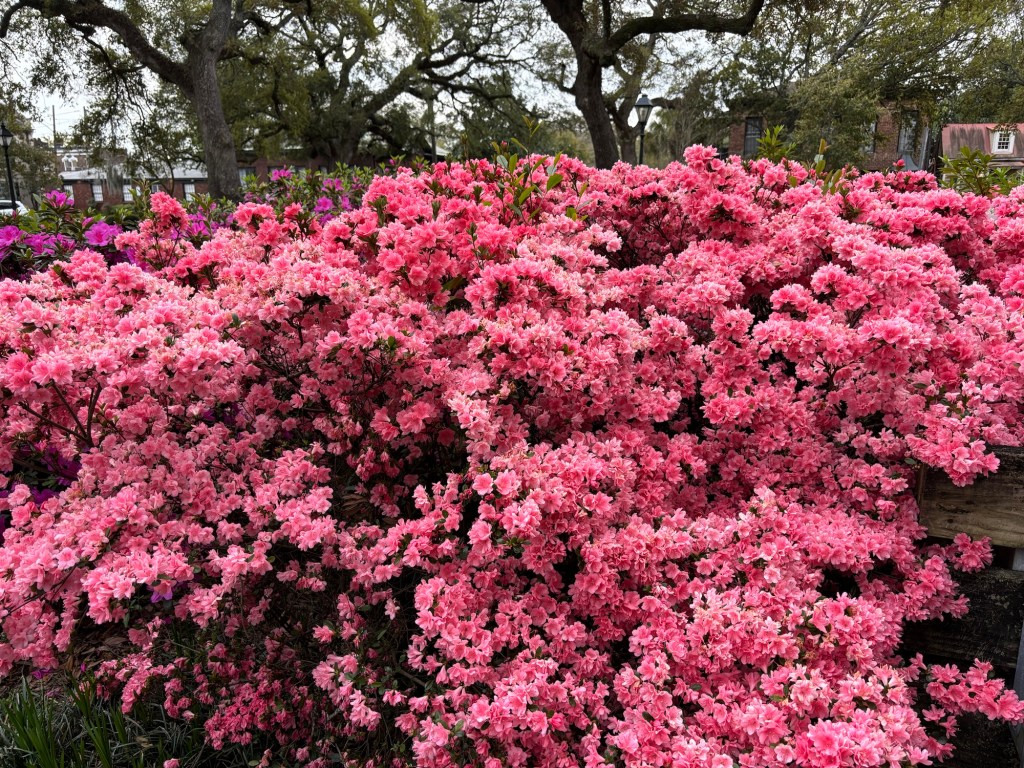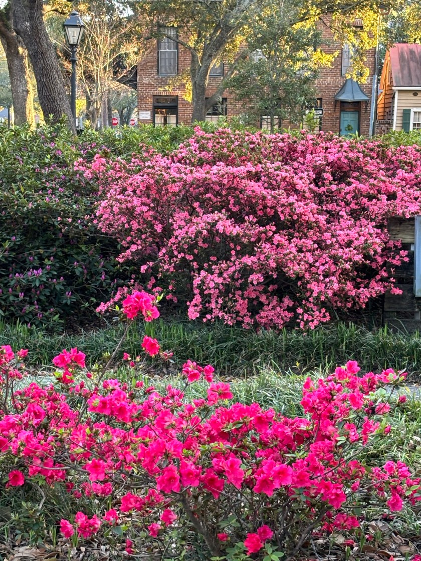 On my Monday morning walk today, I came upon a bit of a surprise: PINK AZALEAS (Savannah’s Springtime Sensation) contrarily blooming in the Heated Heart of August.