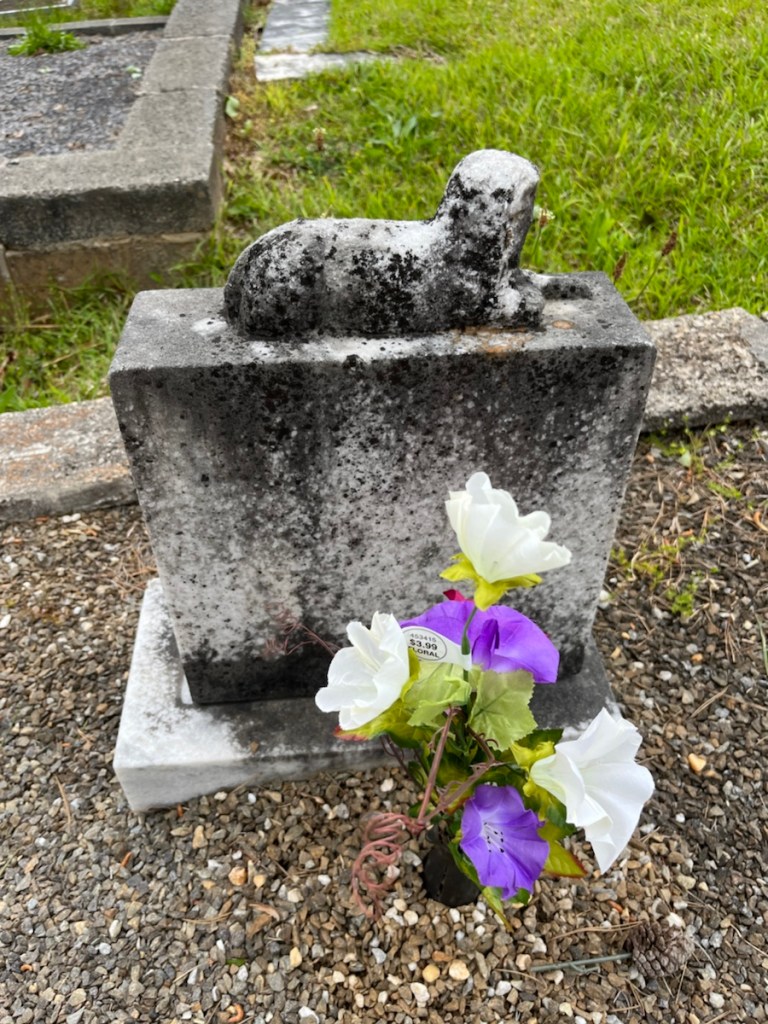 A small mausoleum, circa 1927, darkened and a bit crumbling with age and wear, the small double doors having patinated over the decades into a glorious, deep metallic green.