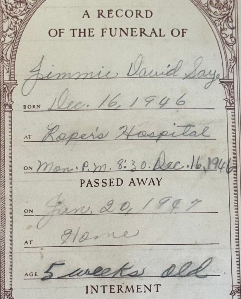 In one file was the funeral information about a brother, Jimmie, who was born in 1946 and only lived for five weeks.