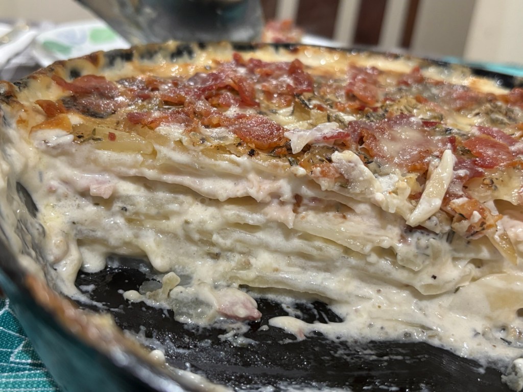 With a supporting cast of leeks, spinach and heavy cream. Topped off with succulent mashed potatoes.