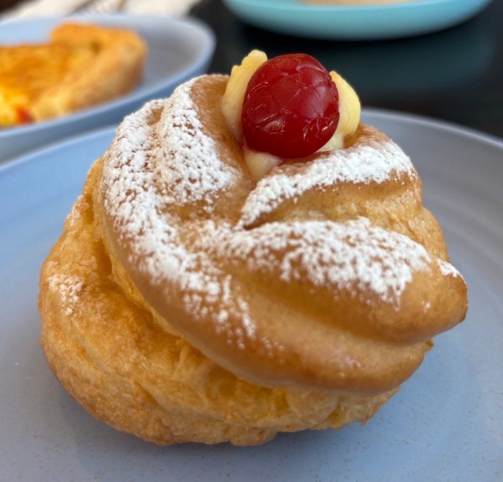 “Zeppole is an Italian cream filled pastry, similar to a cream puff. The cream fillings most often used are chocolate, vanilla, or ricotta. The pastries are usually topped with a candied cherry, and you must not forget the dusting of powdered sugar to finish it off!”