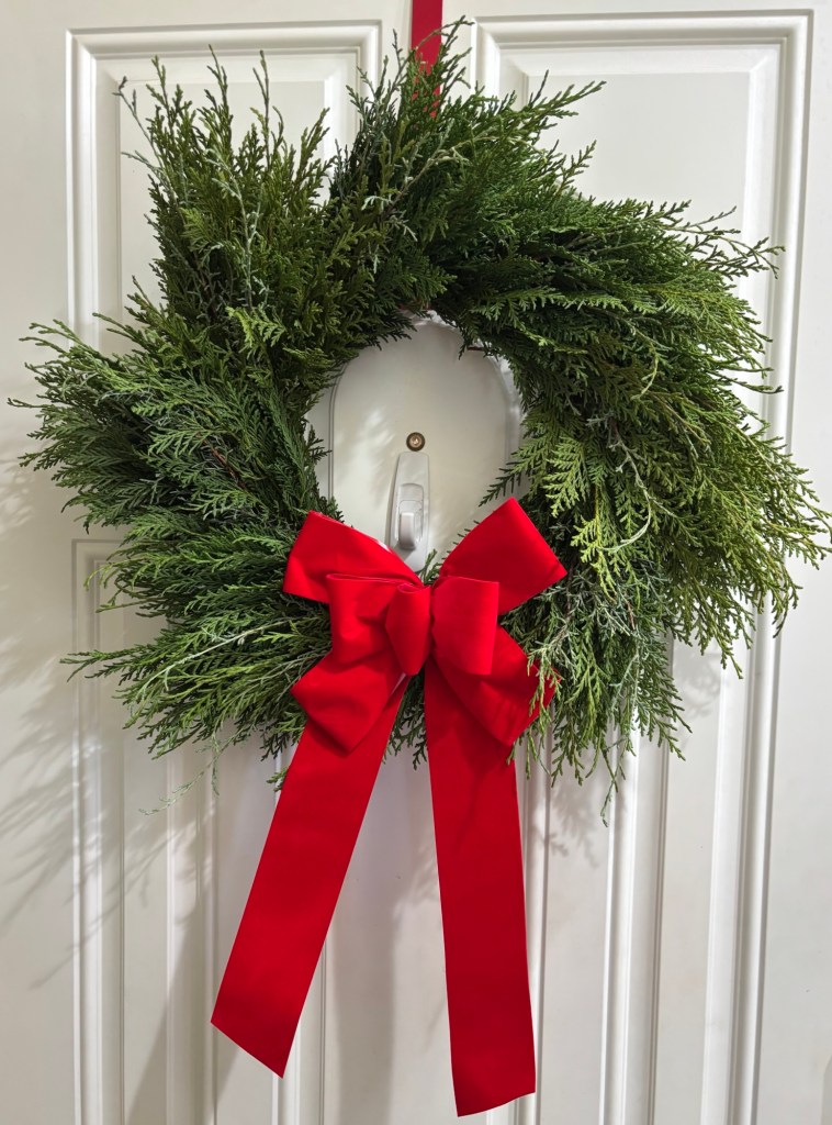 When we got home, Robert put the wreath, along with some branches of spruce, in our shower (!) to freshen them up with some cold water. (Some things in a marriage you simply put up with.)