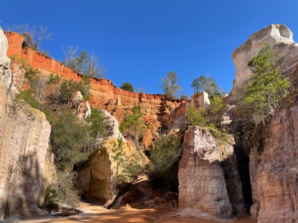 Providence Canyon State Park in southwest Georgia near Lumpkon is one of our state’s most visually stunning parks. And yet it’s here because of man’s misuse of the land! Often called Georgia’s “Little Grand Canyon,” Providence Canyon “is a testament to the power of man’s influence on the land. Massive gullies as deep as 150 feet were caused simply by poor farming practices during the 1800s, yet today they make some of the prettiest photographs within the state.” (Park website). The geological formations caused by massive erosion are indeed extraordinary to behold.