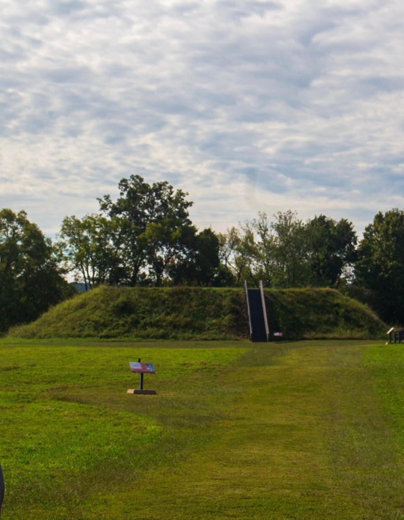 “Home to several thousand Native Americans from 1000 A.D. to 1550 A.D., this 54-acre site protects six earthen mounds, a plaza, village site, borrow pits and defensive ditch. Etowah Mounds is the most intact Mississippian Culture site in the Southeast. Artifacts in the museum show how natives of this political and religious center decorated themselves with shell beads, paint, complicated hairdos, feathers and copper ear ornaments. Hand-carved stone effigies weighing 125 pounds still bear some original pigments.” (Park website)