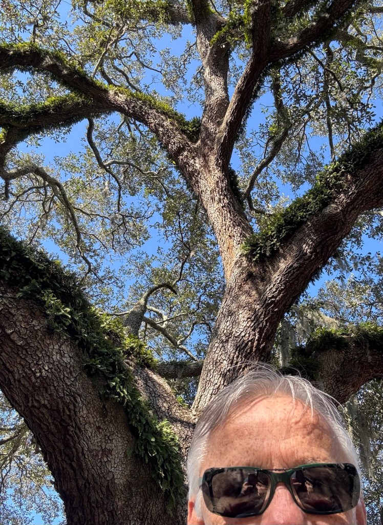 The green plant growing on the live oak tree behind me, Pleopeltis polypodioides, commonly known as Resurrection Fern, is “a native plant known for its ability to survive extreme dehydration and revive when exposed to water. Appearance and behavior: During dry periods, the fern shrivels and turns brown, resembling a dead clump of leaves. It can lose up to 97% of its water content, while most plants can only tolerate a 10% loss.”