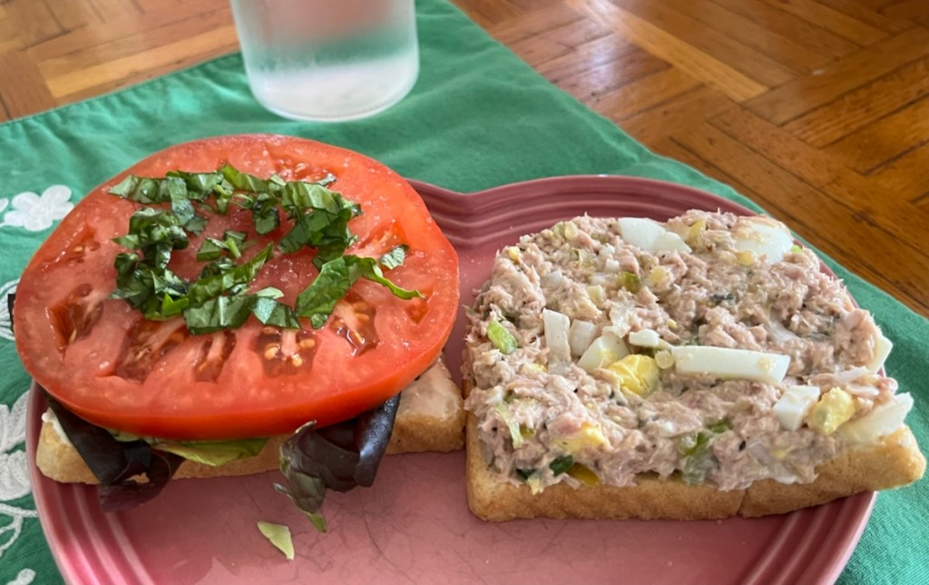 While I, more superiorly, (is that a word?) skillfully position the tuna, tilting rather Cirque de Soleil-ishly, on a bed of lettuce and tomato …