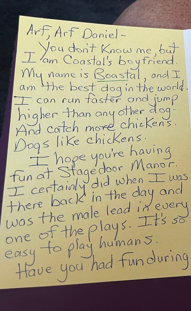 I have been sending him silly cards of encouragement. Here is my latest. In order to understand it, you must know that the family dog is named Coastal. (We live in Savannah, next to the Atlantic Ocean, and my daughter’s medical company is called Coastal Care Partners.)