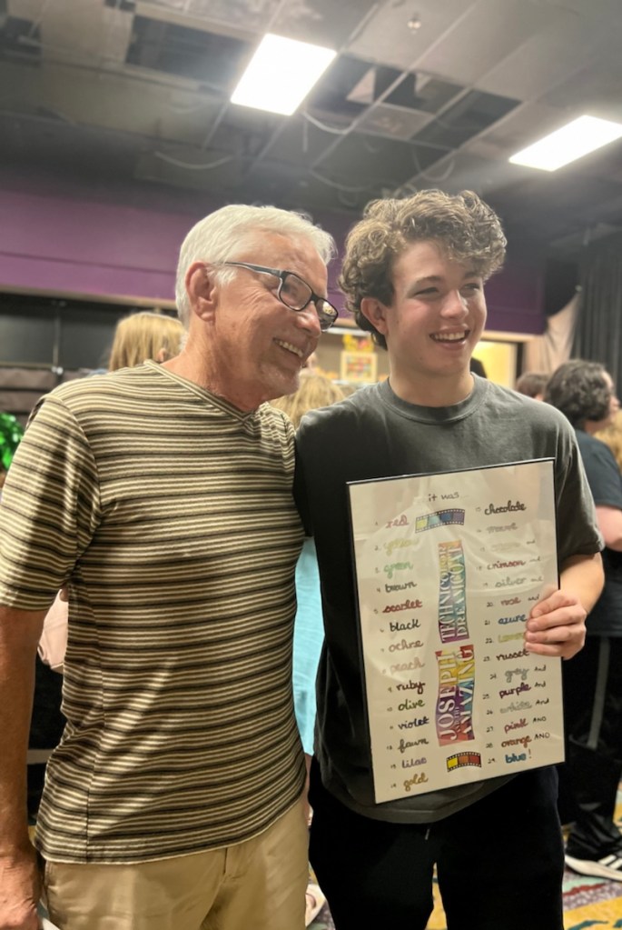 3. Grandson Daniel on closing night of a three-week run as Joseph in “Joseph and the Amazing Technicolor Dreamcoat” here in Savannah. Robert and I gave him a poster listing all the colors in his coat (from lyrics in one of the songs)