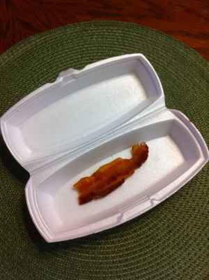 3. Trying to understand why someone would ask for a to-go box for one piece of leftover bacon. I ate breakfast at The Original Pancake House in Savannah the other day with some friends. One of them demolished all his food (the silver dollar pancake meal) except for ONE piece of crisp bacon. Are you with me? The meal is over, right? You get up and pay for your meal. Head on out to the cattle-rustling.