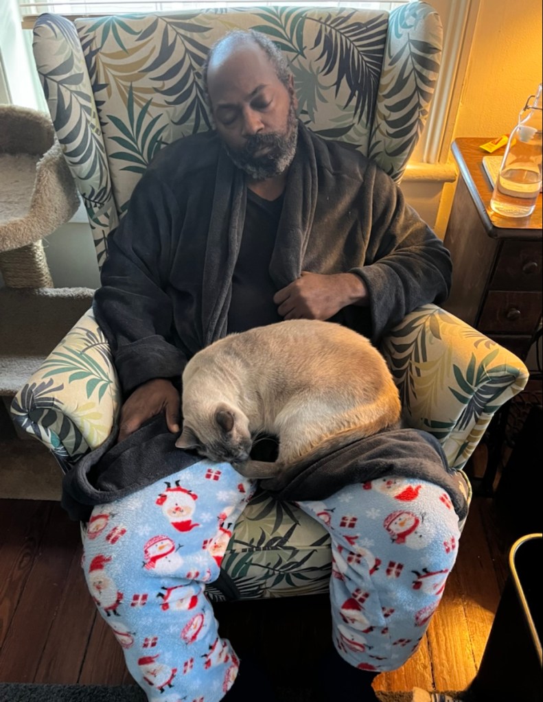 Robert and a big bowl of nuts, as Benny and Boopers vie for prime real estate on his Santa pants lap and edge toward his gay vodka t-shirt, as he balances his iPad in his right hand and shows off his wedding ring on his left, while leaning away from his mounted guitar. (Whew)