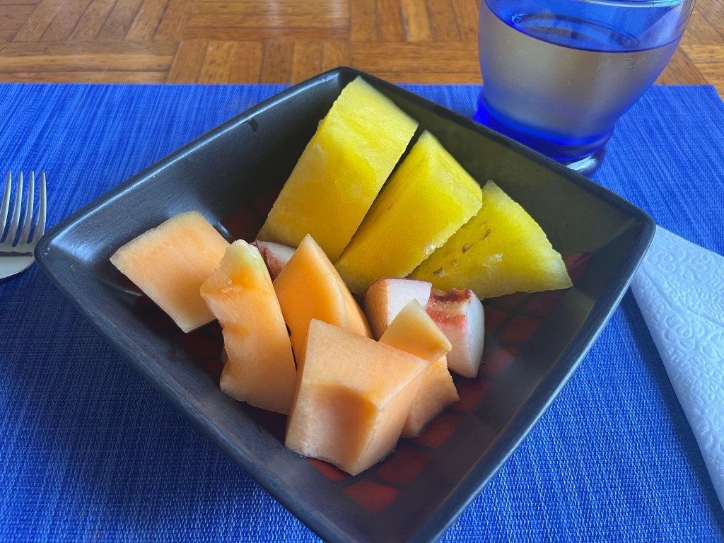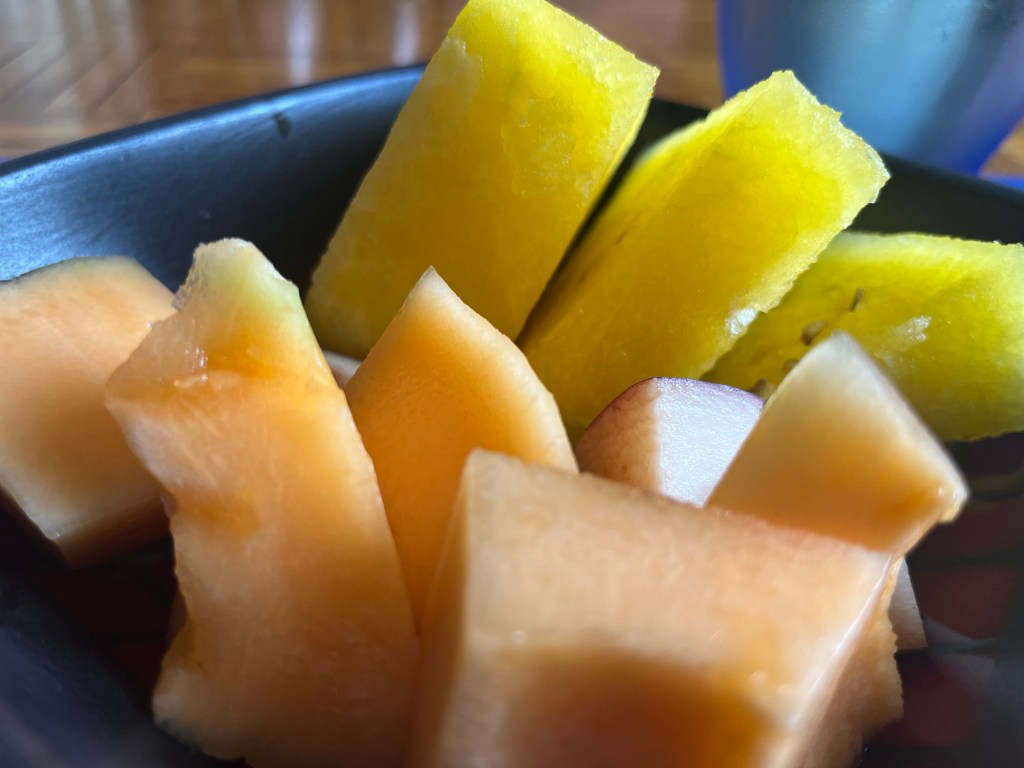1. Robert’s morning fruit bowl. Yellow watermelon, cantaloupe and white flesh peaches.
