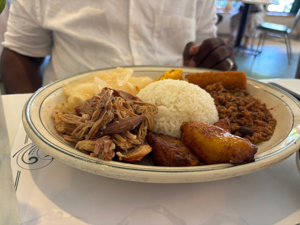 For HR: THE CLASSIC CUBAN SAMPLER: White Rice, Black Beans, “Picadillo” Ground Beef, Roast Pork, Sweet Plantains, Ham Croquette, Cuban Tamale, and Cassava with Cuban Mojo