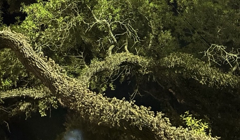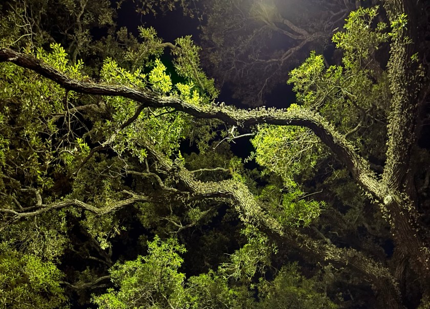 I paused and gazed up into the heavy, meandering limbs of the ancient Live Oak trees, limbs laden with both desiccated (for now) resurrection fern and new, brilliant green spring leaves.