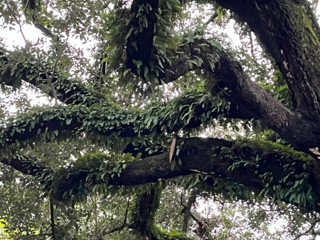 Here’s resurrection fern this evening from outside our front door, looking up.