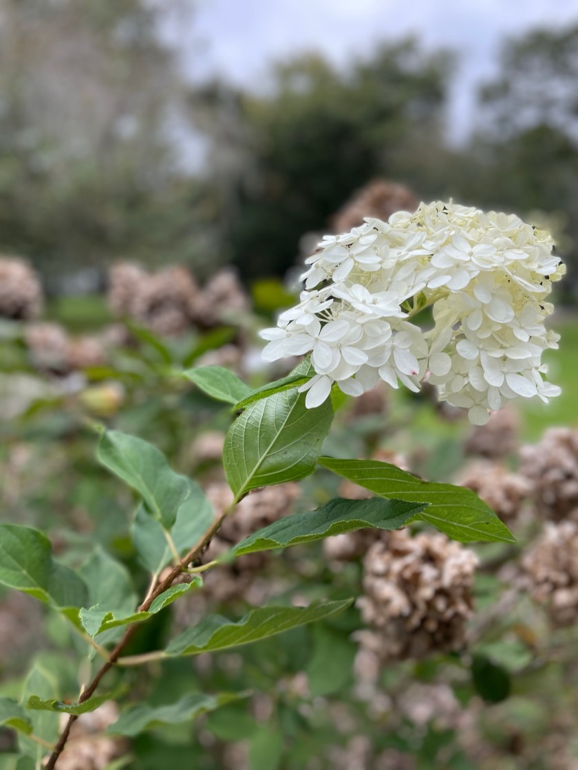“It’s the end of October,” I thought. “Isn’t it a little late for hydrangeas to still be blooming?” But glancing up and down the row of bushes, I noticed that all the other hydrangeas were NOT blooming, except for this LONE, stubborn survivor.