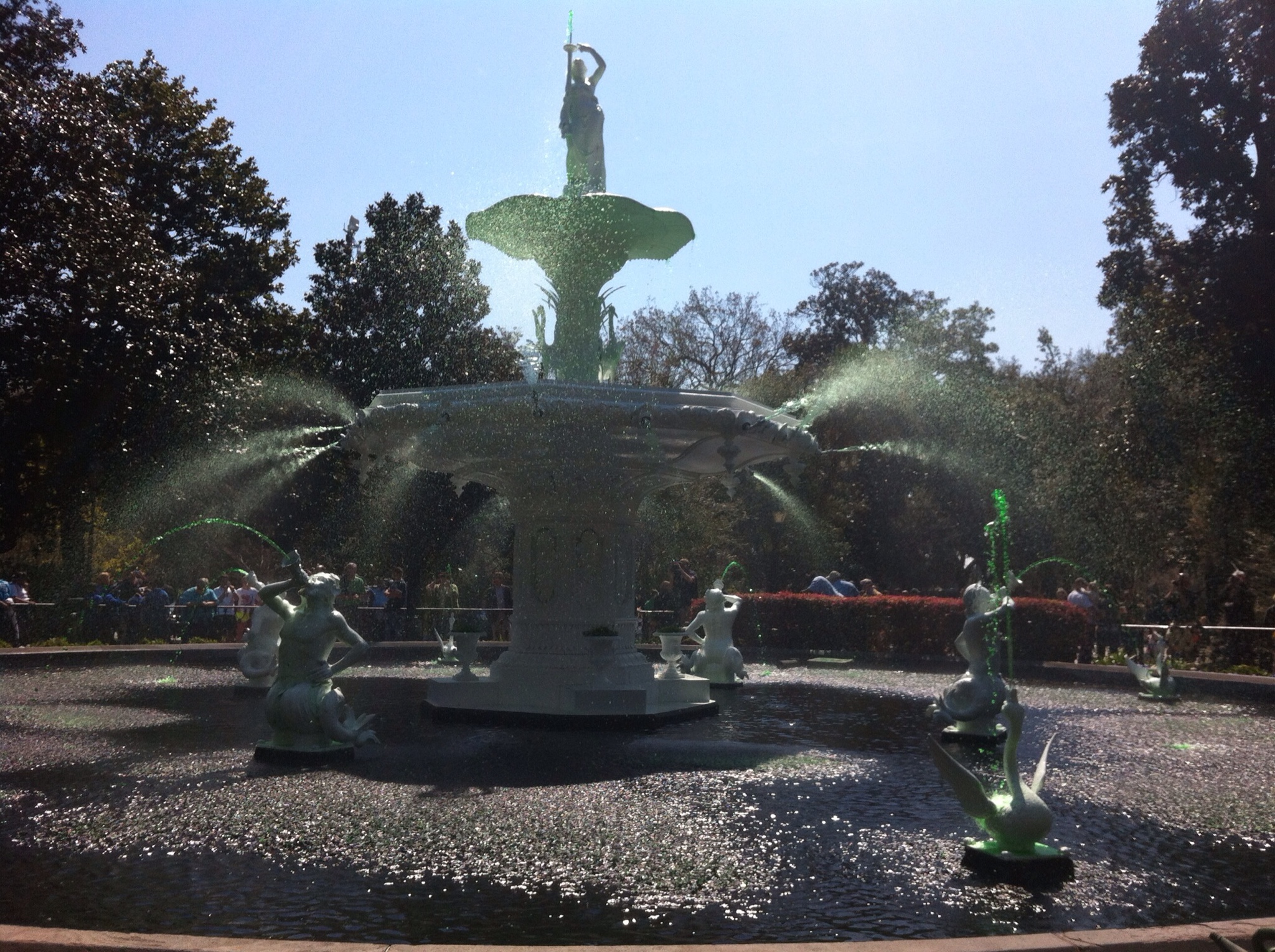 In a similar vein, what do many people associate with our city’s incredibly popular March holiday? Drinking on River Street, of course. But that aspect of the St. Patrick’s Day celebration is only one part of the wonderful holiday, albeit a decidedly profitable one, and the one that often gets the most press. However, so much more, SO MUCH MORE captures the attention and interest of most Savannahians. Which brings me back to the greening of the fountains. End of Tangent.