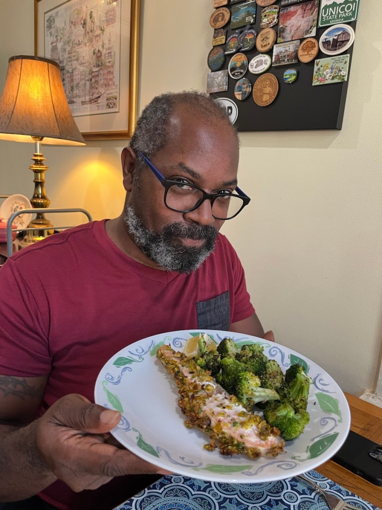 We have also gotten to know the delightful butcher Elise at our Savannah Fresh Market. She puts the meal kits together. When Robert showed her the kit he chose for our Easter Supper, Elise took the kit from his hands and replaced it with larger lamb steaks. (Get to know your butcher!)