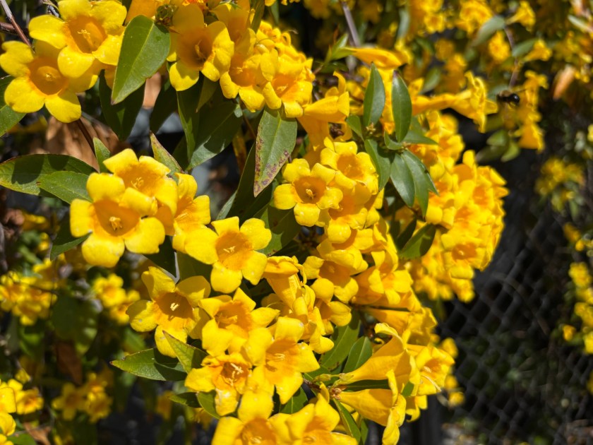 “Carolina yellow jasmine (sometimes called false jasmine or Carolina jessamine) is a member of the family Gelsemiaceae. It is a vine native to the southern United States, Mexico, and Guatemala. Its name derives from the Italian name for jasmine, gelsomino, and the species name indicates that it is evergreen. It was named the state flower of South Carolina in 1924.” North Carolina Extension Gardener